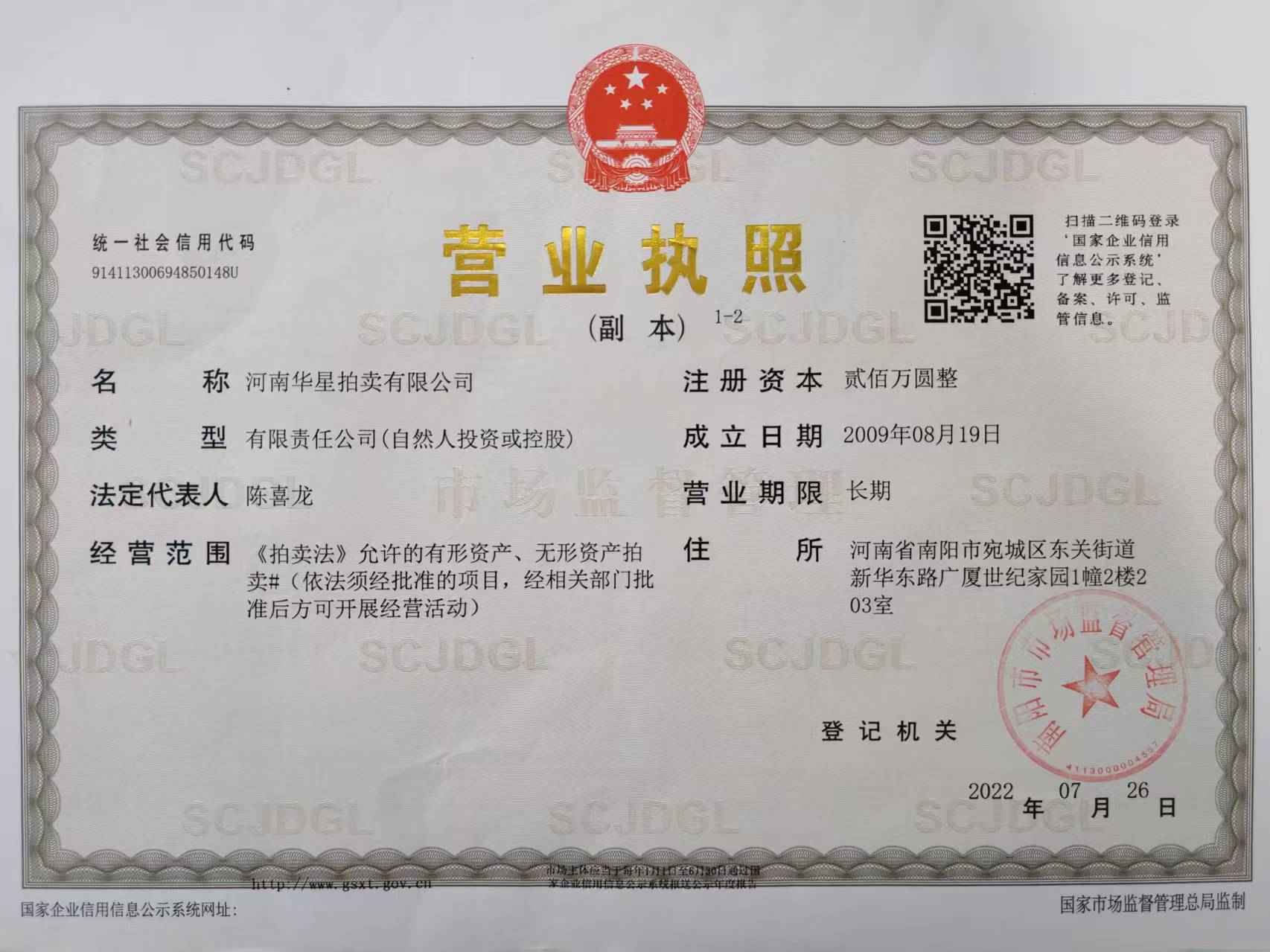 2013年7月取得南陽市人民政府指定、河南省財(cái)政廳頒發(fā)河南省公物拍賣資格證書