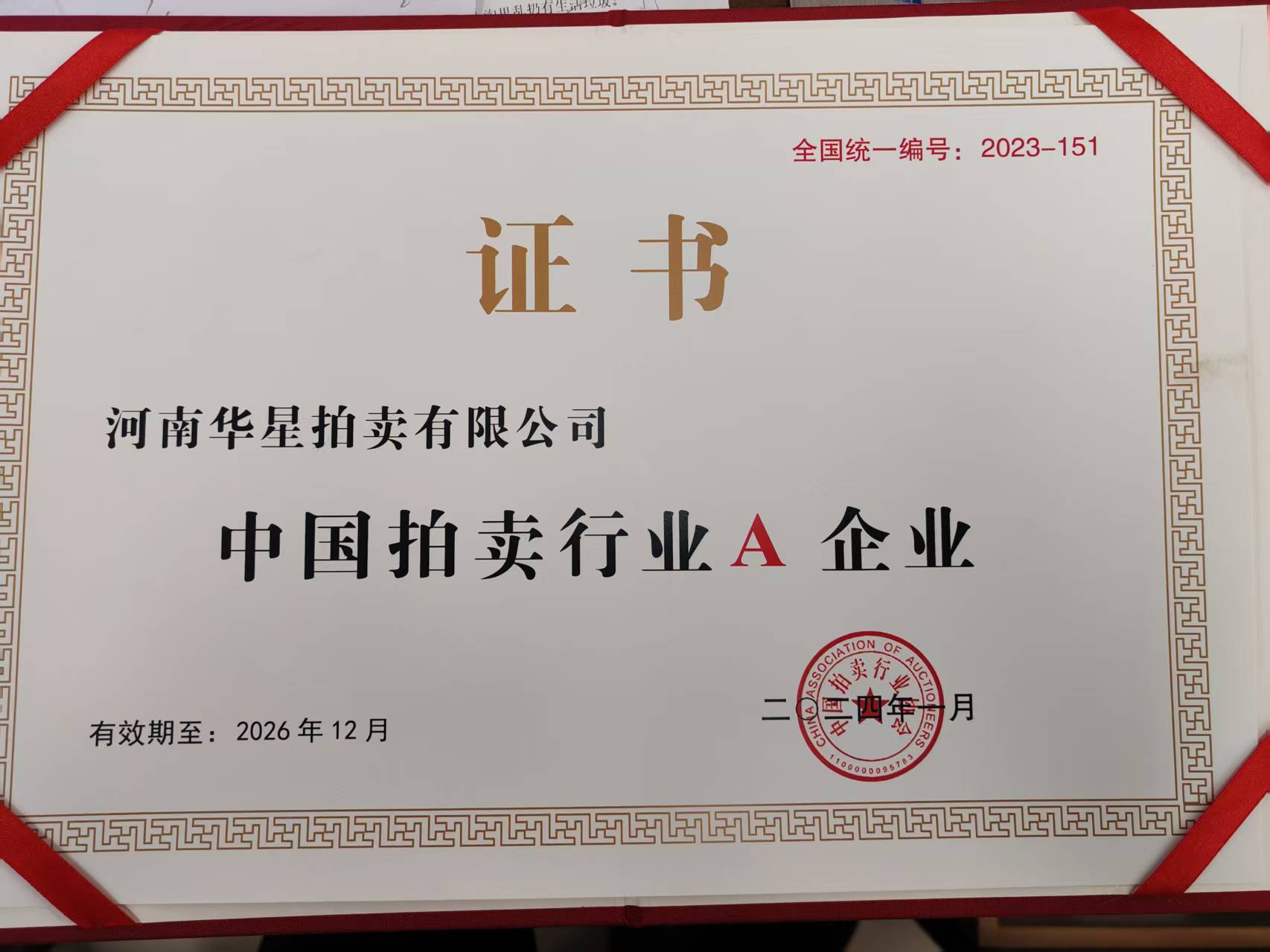 2023年12月我公司經(jīng)中拍協(xié)全國拍賣企業(yè)等級評估工作辦公室評為A級企業(yè)